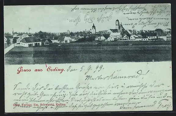 Mondschein-AK Erding, Ortspanorama mit Landstrasse
