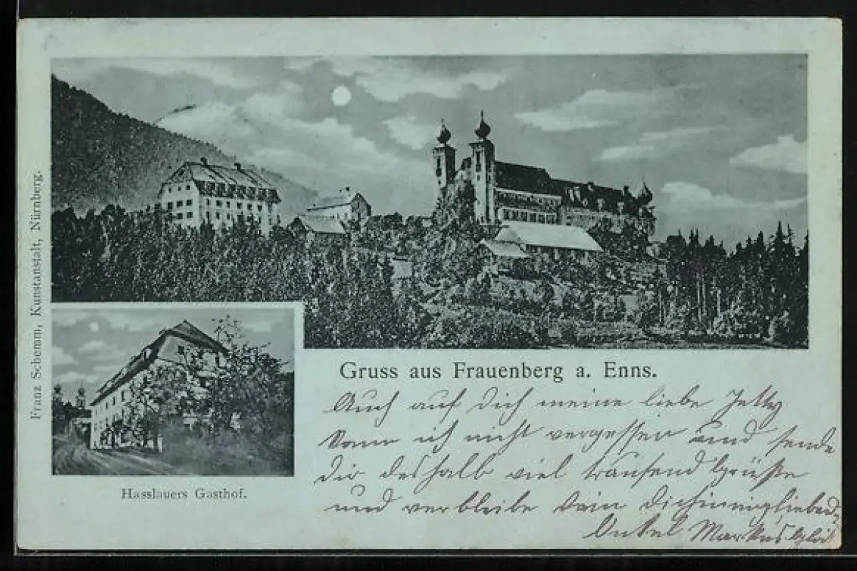 Mondschein-AK Frauenberg a. Enns, Hasslauers Gasthof, Ortsansicht