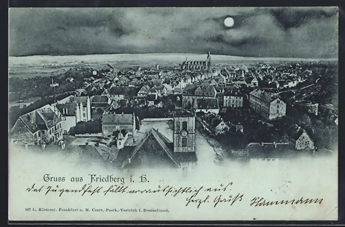 Mondschein-AK Friedberg i. B., Ortsansicht aus der Vogelschau