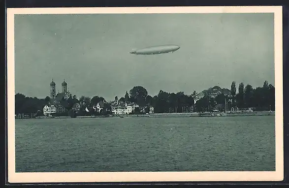 Mondschein-AK Friedrichshafen a. B., Zeppelin-Lufftschiff über dem Bodensee vor Stadtpanorama