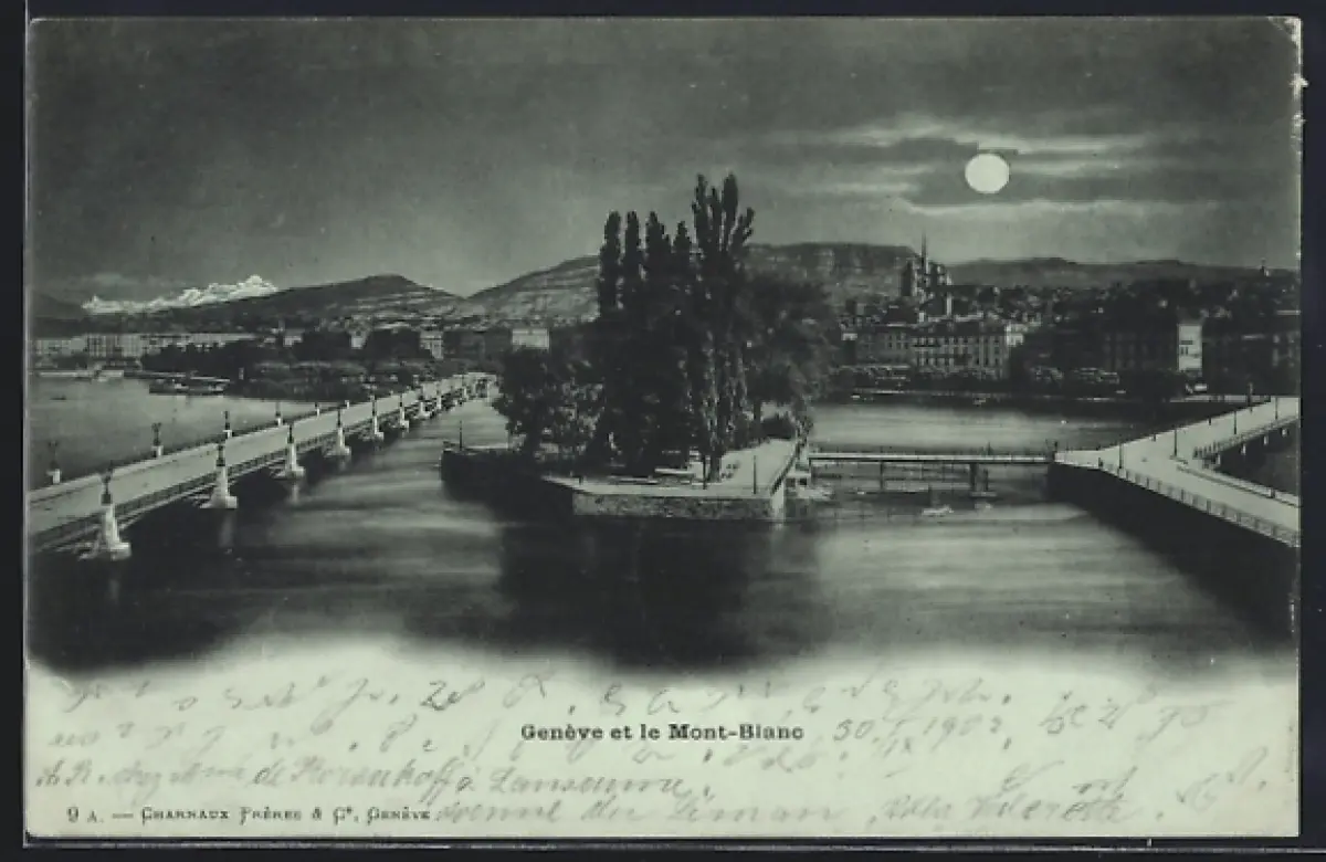 Mondschein-AK Genève, Genève et le Mont-Blanc