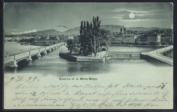 Mondschein-AK Genève, Panorama et le Mont-Blanc