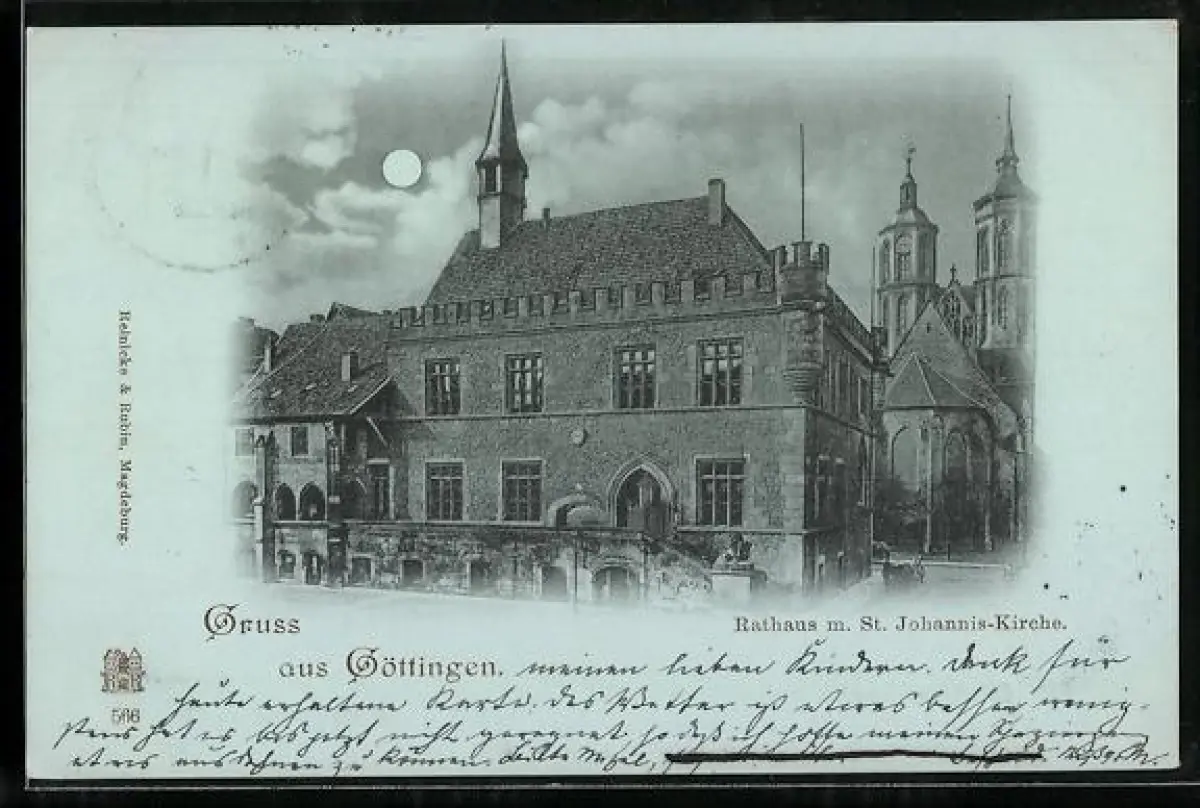 Mondschein-AK Göttingen, Rathaus, St. Johannis-Kirche