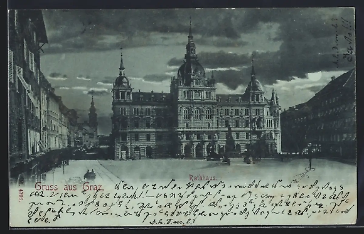 Mondschein-AK Graz, Rathaus mit Denkmal