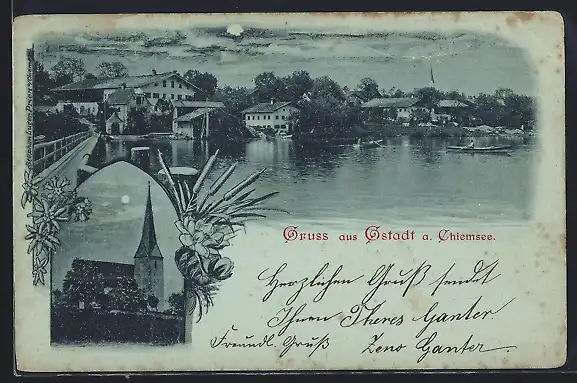 Mondschein-AK Gstadt a. Chiemsee, Uferpartie mit Ruderboot und Kirche