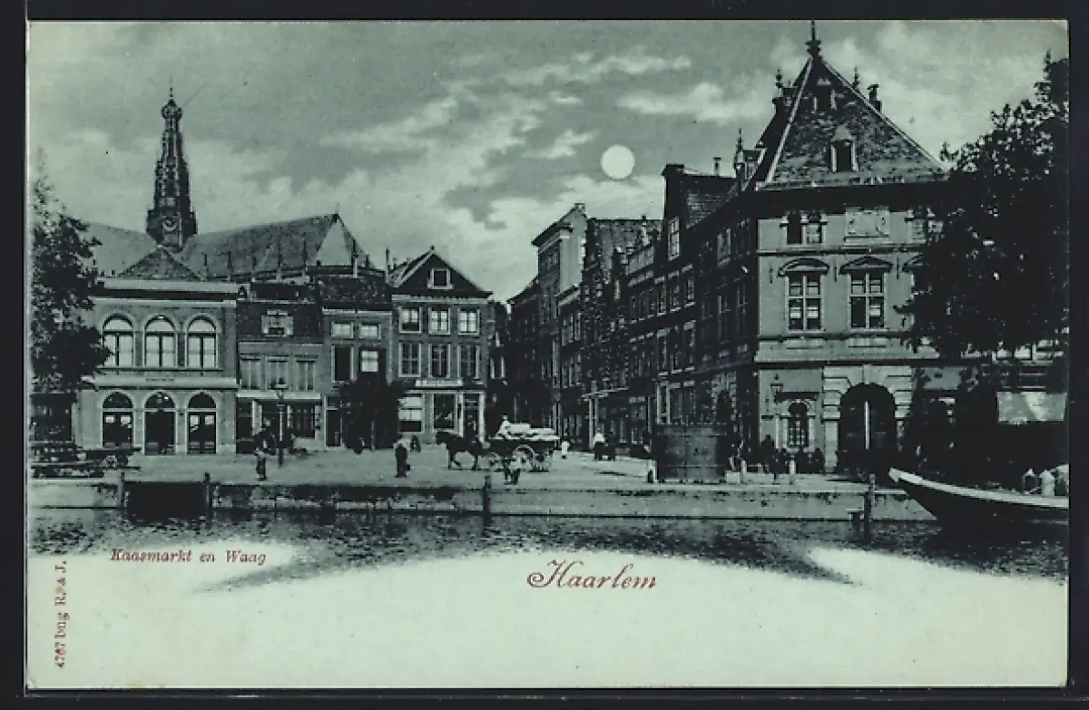 Mondschein-AK Haarlem, Kaasmarkt en Waag