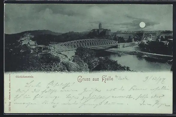 Mondschein-AK Halle / Saale, Giebichenstein mit Brücke aus der Vogelschau