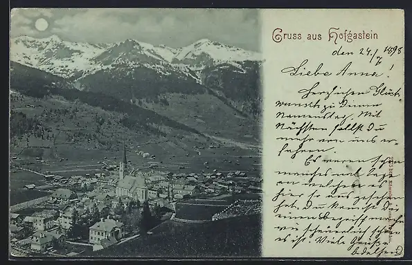 Mondschein-AK Hofgastein, Totalansicht mit Bergpanorama aus der Vogelschau