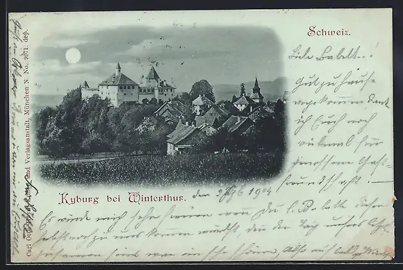 Mondschein-AK Kyburg bei Winterthur, Teilansicht mit Burg
