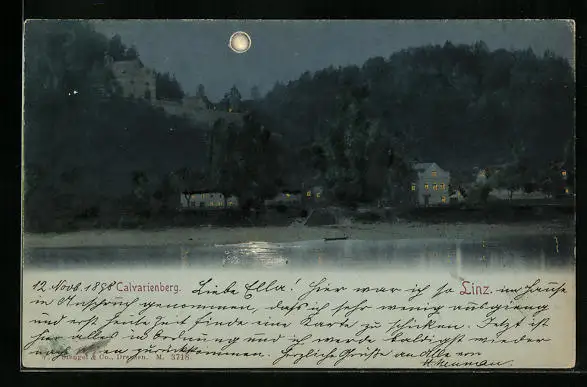 Mondschein-AK Linz, Calvarienberg mit Uferpartie