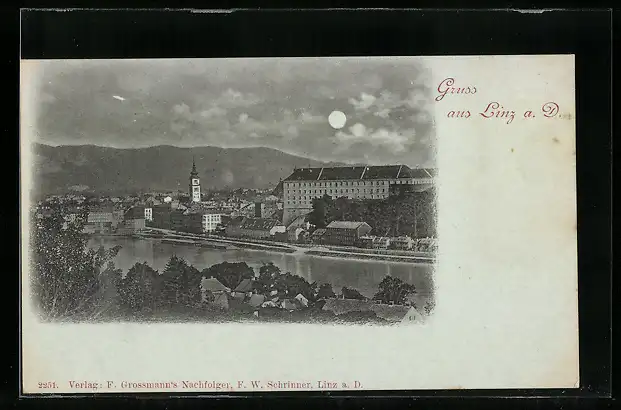 Mondschein-AK Linz a. D., Flusspartie mit Kirche