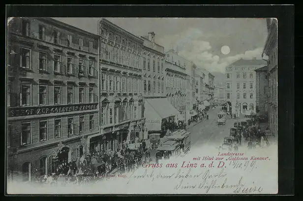 Mondschein-AK Linz a. D., Strassenbahn am Hotel zur Goldenen Kanone, Landstrasse