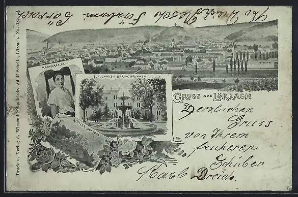 Mondschein-AK Lörrach, Schulhaus und Springbrunnen, Röttler Schloss, Markgräflerin