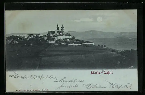 Mondschein-AK Maria-Taferl, Teilansicht mit Kirche und Fernblick