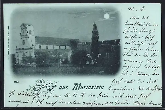 Mondschein-AK Mariastein, Kirche mit Feldern