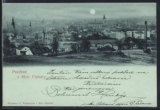 Mondschein-AK Mor. Ostrava, Totalansicht von einer Anhöhe aus, mit Fabrikschlot