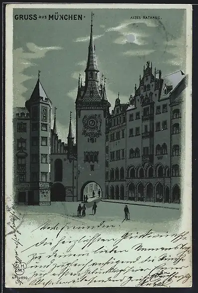 Mondschein-AK München, Altes Rathaus mit Strassenpartie
