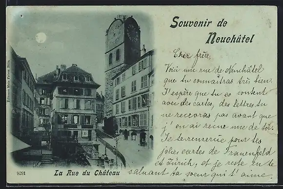 Mondschein-AK Neuchâtel, La Rue du Château