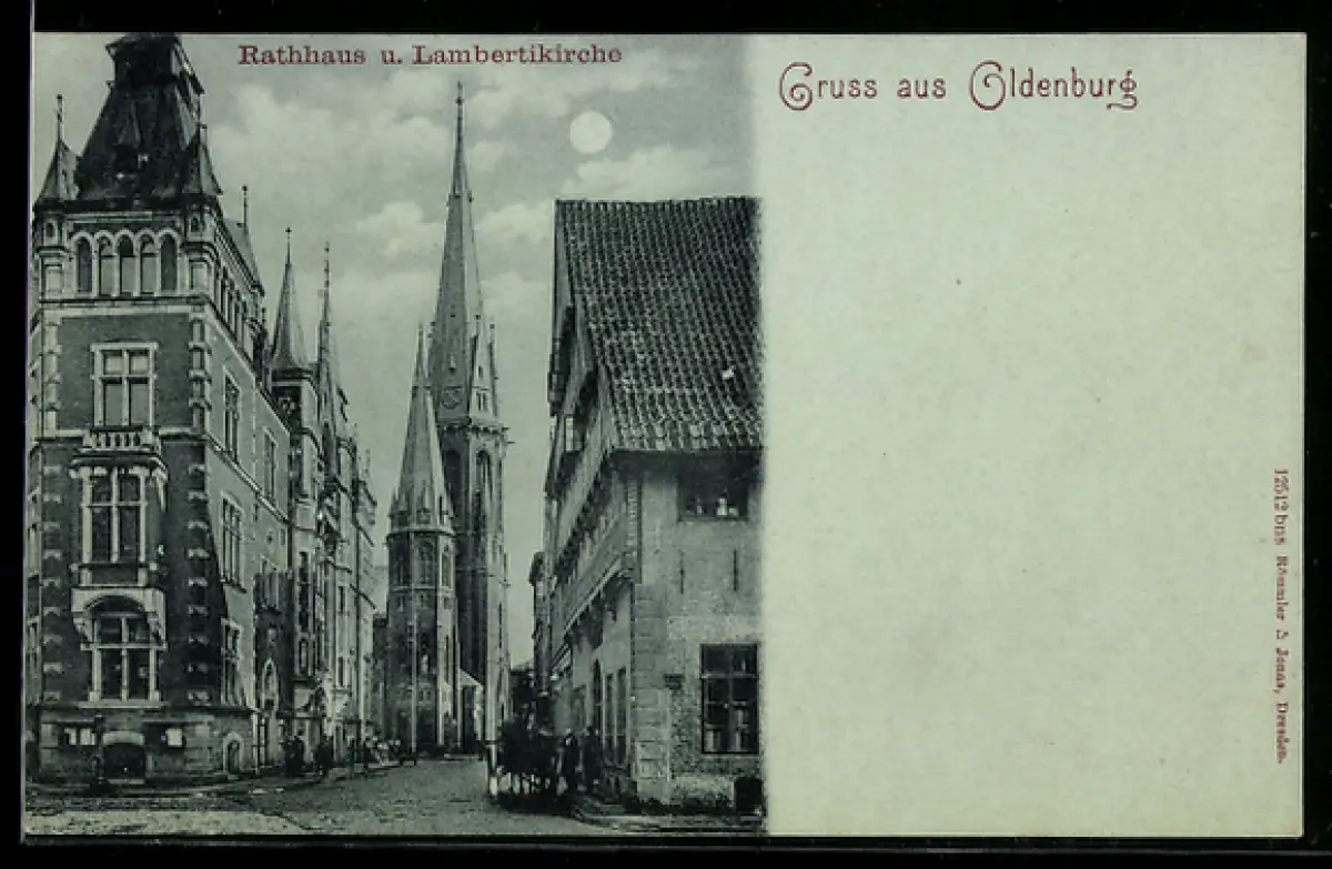 Mondschein-AK Oldenburg, Rathaus, Lambertikirche
