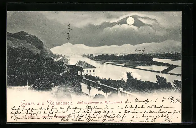 Mondschein-AK Rolandseck, Ortsansicht mit Siebengebirge