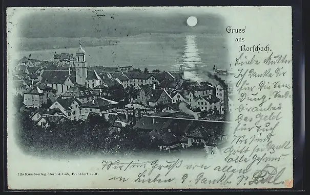 Mondschein-AK Rorschach, Ortsansicht mit Seeblick aus der Vogelschau