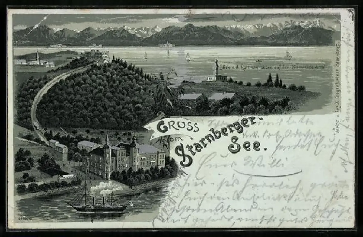Mondschein-AK Rottmannshöhe /Starnberger-See, Blick auf das Bismarckdenkmal