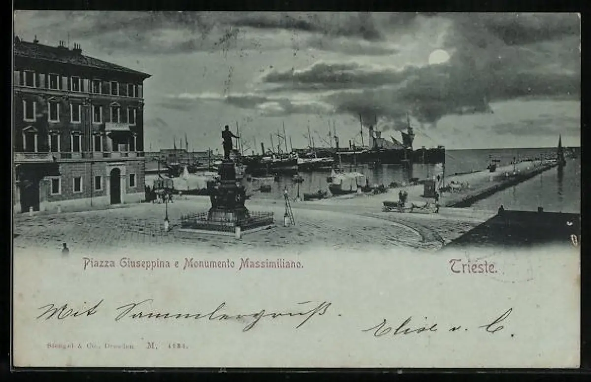 Mondschein-AK Trieste, Piazza Giuseppina e Monumento Massimiliano