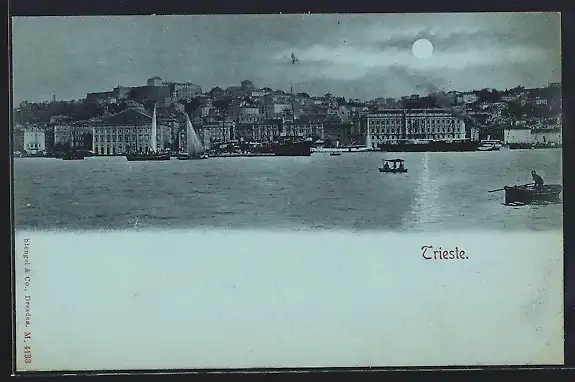 Mondschein-AK Trieste, Stadtansicht über das Wasser gesehen