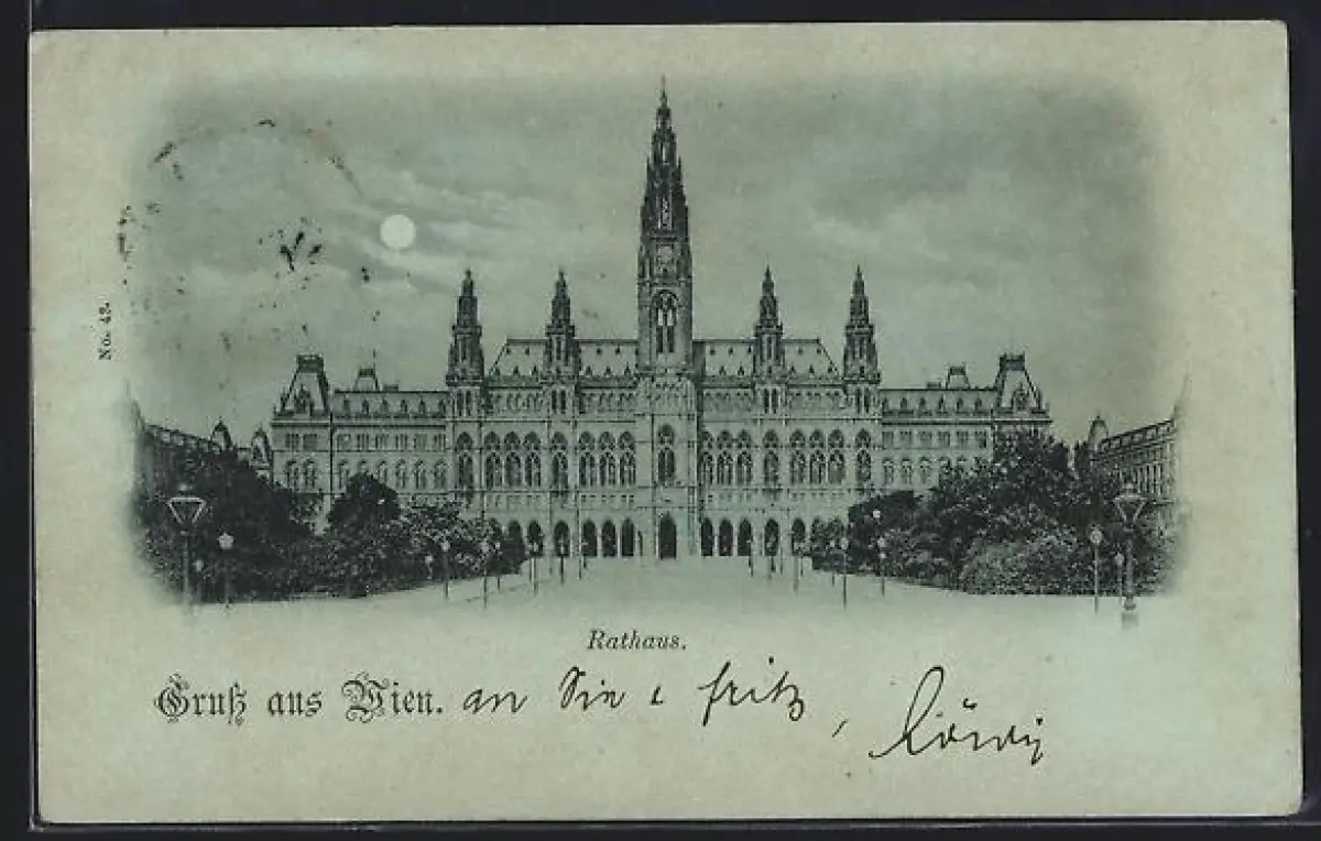 Mondschein-AK Wien, Rathaus mit Strassenpartie