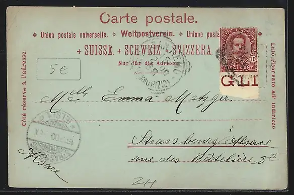 gelaufen 1900, Eckknicke oben und li. unten, Bugspur und kleiner Einriss re. mittig, kleiner Einriss li. oben