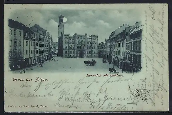 Mondschein-AK Zittau, Marktplatz mit Rathaus
