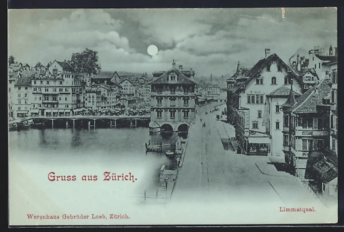 Mondschein-AK Zürich, Limmatquai mit Ortspanorama aus der Vogelschau