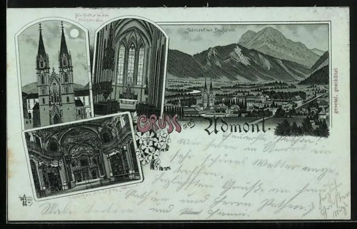 Mondschein-Lithographie Admont, Stiftskirche, Hochaltar, Ortsansicht aus der Vogelschau