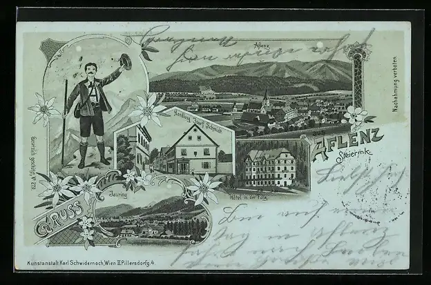 Mondschein-Lithographie Aflenz /Steiermk., Jauring, Handlung Josef Schmidt und Hotel in der Fölz