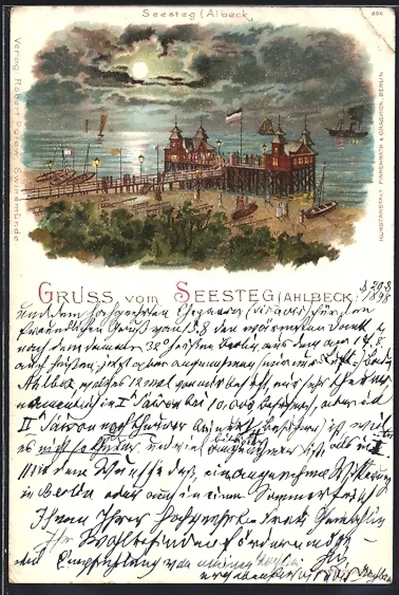 Mondschein-Lithographie Ahlbeck / Ostseebad, Blick auf den Seesteg im Vollmondlicht