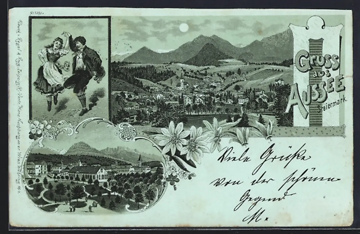 Mondschein-Lithographie Aussee /Steiermark, Ortsansicht im Vollmondlicht, Tanzendes Paar in Trachten