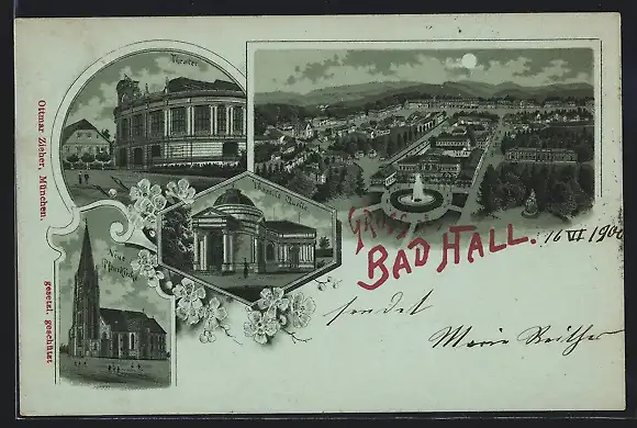 Mondschein-Lithographie Bad Hall, Gesamtansicht aus der Vogelschau, Theater, Tassilo-Quelle, neue Pfarrkirche
