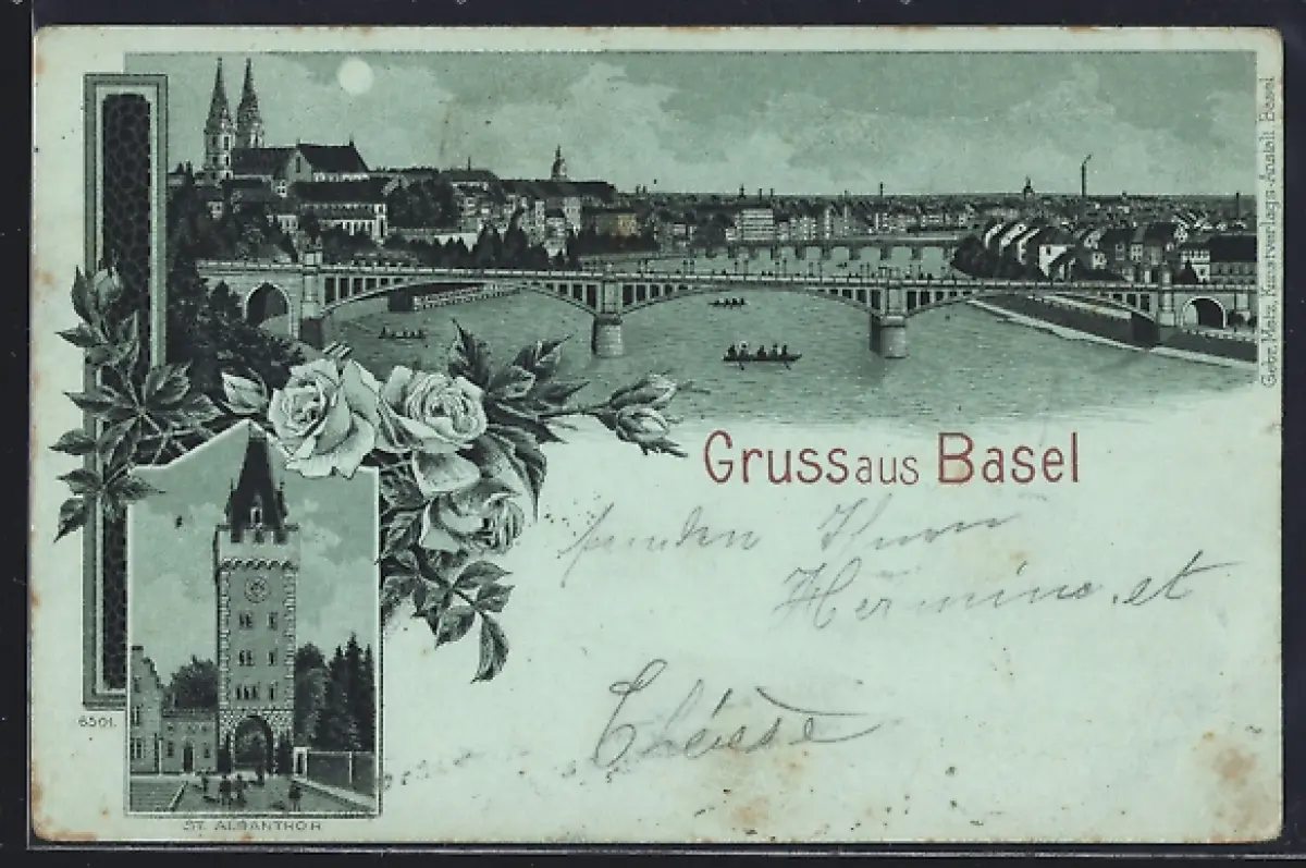 Mondschein-Lithographie Basel, Uferpartie mit Brücke, St. Albantor