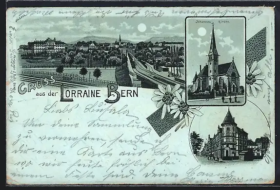Mondschein-Lithographie Bern, Lorraine, Johannes-Kirche, Eckhaus, Totalansicht