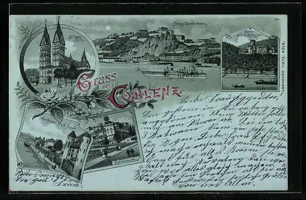 Mondschein-Lithographie Coblenz, St. Castor Kirche, Fort Constantin, Alte Häuser an der Mosel