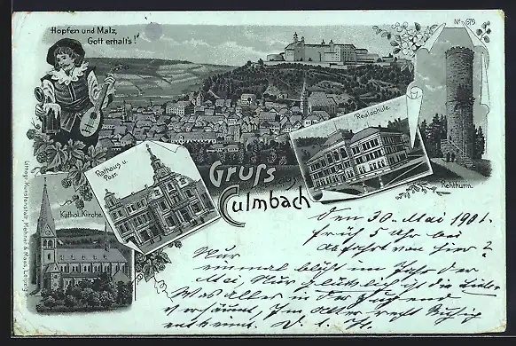 Mondschein-Lithographie Culmbach, Realschule, Rehturm und Katholische Kirche