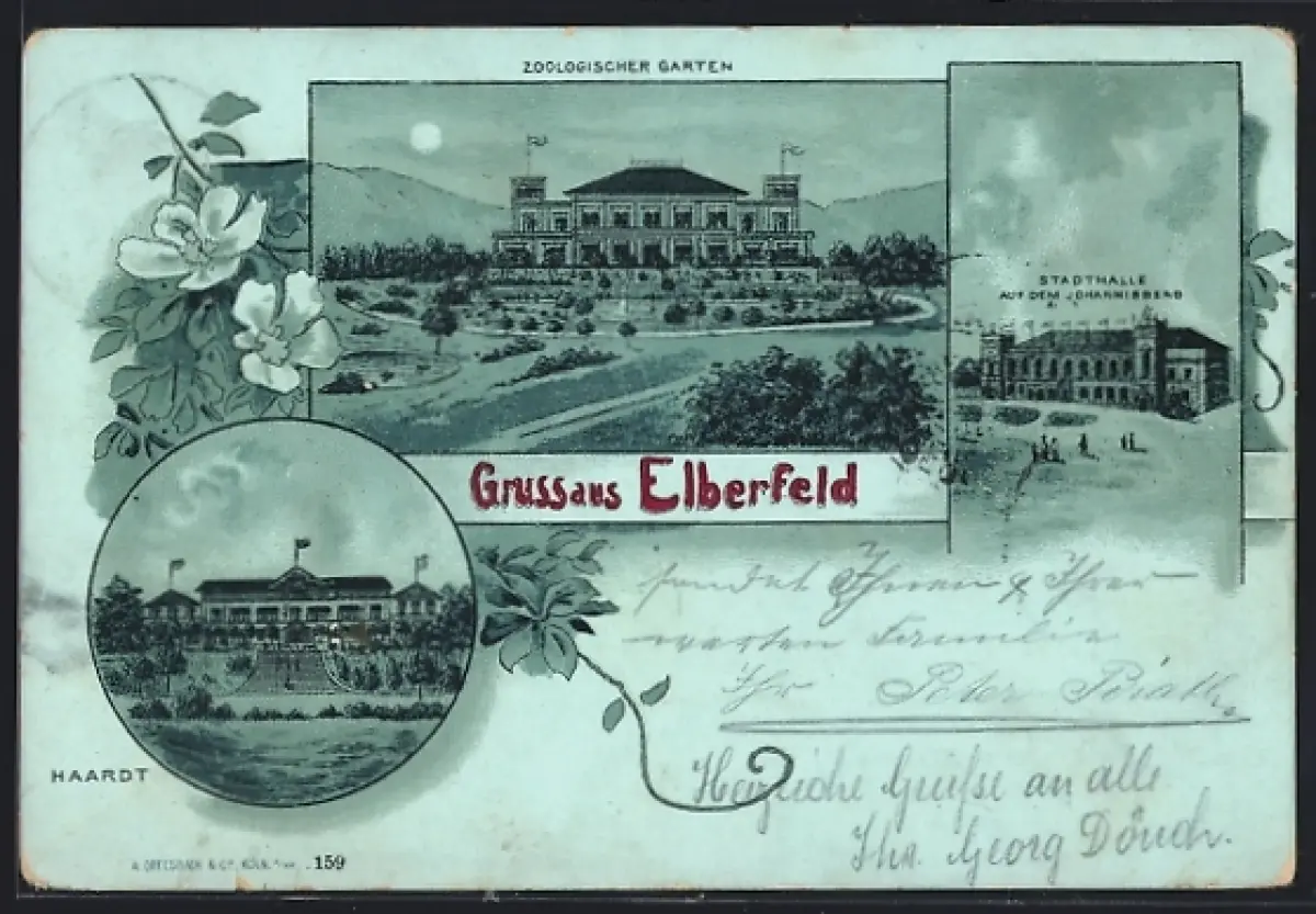 Mondschein-Lithographie Elberfeld, Zoologischer Garten, Stadthalle auf dem Johannisberg, Haardt