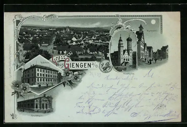 Mondschein-Lithographie Giengen a /B., Fruchthalle, Realschule, Stadtkirche