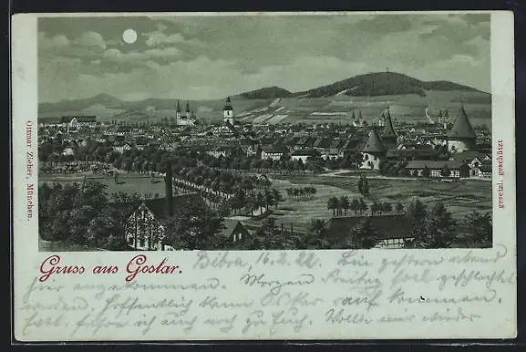 Mondschein-Lithographie Goslar, Ortsansicht mit Fachwerkshäusern