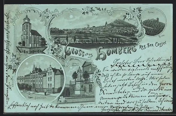 Mondschein-Lithographie Homberg /Reg. Bez. Kassel, Kirche, Seminar, Krieger-Denkmal
