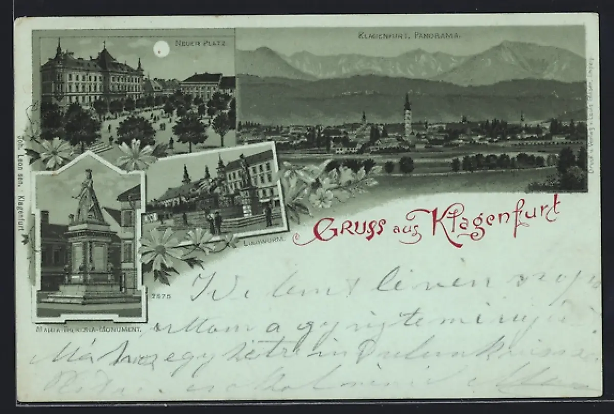 Mondschein-Lithographie Klagenfurt, Neuer Platz, Lindwurm, Maria Theresia-Monument