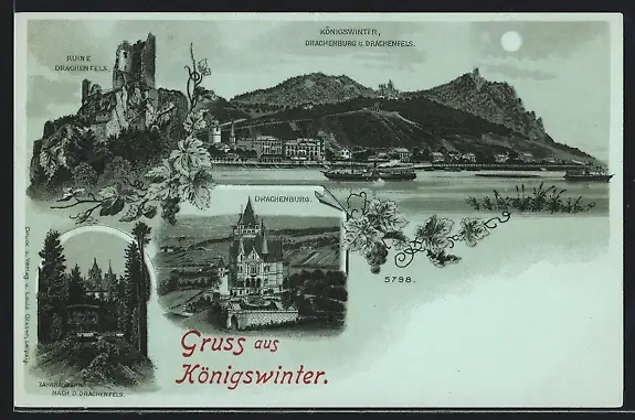 Mondschein-Lithographie Königswinter, Drachenburg u. Drachenfels, Zahnradbahn