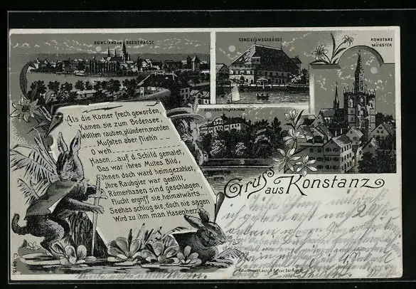 Mondschein-Lithographie Konstanz, Münster, Conciliumsgebäude, Totalansicht, Hase mit Schwert