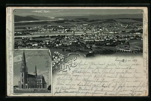Mondschein-Lithographie Linz, Teilansicht, Maria Empfängnis Dom