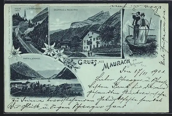 Mondschein-Lithographie Maurach am Achensee, Gasthaus zum Neuwirth, Kirche Eben mit Zahnradbahn